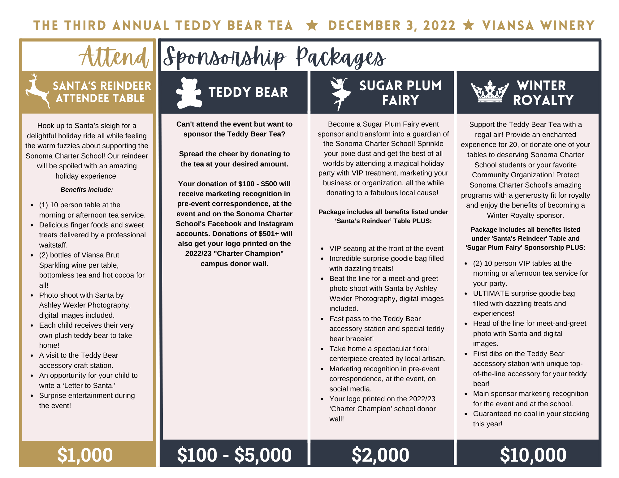 ATTEND: Hook up to Santa’s sleigh with your purchase of a seat or a 10-person Santa's Reindeer attendee table at the morning or afternoon tea service for a delightful holiday ride all while feeling the warm fuzzies about supporting Sonoma Charter School!SPONSOR: Sonoma Charter School is seeking generous members of our community to sponsor this event and support our outstanding school. The Teddy Bear Tea is part of our foundational fundraising efforts that provide funds that help pay for music, performing arts, athletics, Middle School electives, leadership and campus improvements! Your Teddy Bear, Sugar Plum Fairy or Winter Royalty sponsorship will directly fund these exciting efforts. View the Attendee and Sponsorship Package information for a full list of benefits.